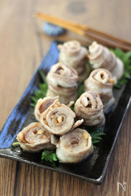 『レンジで簡単。豚バラのくるみ味噌巻き』