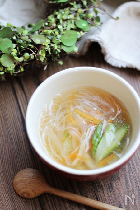 細くカットした常備野菜と春雨のコンソメスープ。お野菜の甘みと旨みが体にしみる優しい味わいです。のどごしも良いので、ふだんの食事はもちろん、食欲がない時や、風邪をひいた時にもおすすめです。