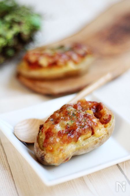 ちょっと小腹がすいた時などに、市販のミートソースを使えばとっても簡単に作れます。いつものじゃがいもがころんとしたかわいらしい見た目に仕上がるので、子どもも喜んでくれるはず。おもてなしにも使える便利な一品ですよ。