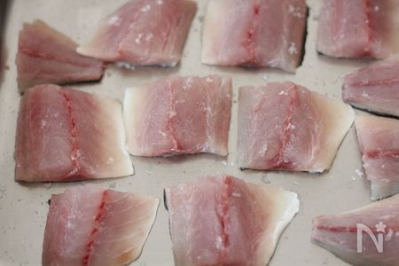 2.三枚おろしにしたあじを3等分に切って塩を振り、10分ほどおく。出てきた水気をペーパーでふき取り、片栗粉を薄くつける。
