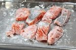 生鮭はできれば皮をひき、塩こしょうをして、食べやすい大きさに切る。 片栗粉をまぶし、両面こんがり焼き色が付くまで焼いて取り出しておく。 |