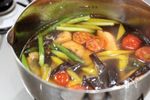 鍋に水と鶏がらスープの素とにんにく、しょうがを入れて沸騰させ、下準備した野菜を入れる。サッと煮たら、鮭を入れて醤油を入れて火と混ぜしたら火を止めて酢を入れる。 | |