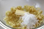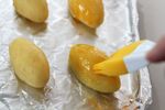 1を耐熱ボールに入れてさつまいもをマッシュし、砂糖、無塩バターを加えて混ぜ、牛乳と卵黄(つや出しように大さじ1ほどとっておく)も入れる。ここでぼそぼそするようなら、牛乳をさらに大さじ1足す。 | |