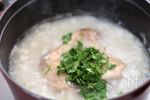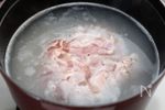 米をとぎ、鍋に入れて水を加えて加熱する。沸騰したらなべ底からゆっくりとはがすようにかき混ぜ、鶏がらスープの素、塩を加えて鶏肉をのせる。蓋をずらして乗せ、弱火で20分炊く。 | |