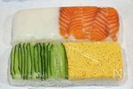 すし飯を半量ずつネタの上にのせて敷いておいたラップをかぶせて包む。 上から均等な高さになるようぎゅっと押す。 |