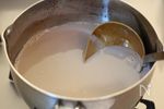 鍋に黒豆の煮汁と豆乳を入れ、沸騰直前まで温めて火を止める。 ゼラチンを加え、しっかりと溶かす。 |