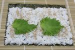 白ごまをまんべんなくふり、すし飯の真ん中より少し手前に大葉を置く。 | |
