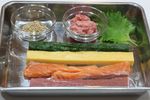 大葉の上にまぐろ、サーモン、厚焼き玉子、きゅうりを置き、市場の奥側にねぎとろをおく。 | |