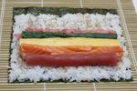 巻きすの上に海苔をおき、すし飯をおく。奥2㎝ほど開けて、隙間なく平らになるように。 | |