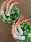 オクラの上に甘エビを尻尾ギリギリまで殻を剥いて飾り、その横にさらに半分に切ったかぼすとディルを添える | |