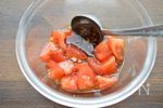 おいしく作るポイントは、一番最初にトマトを切って<タレ>に漬けること!(※漬けてから他の作業をします)