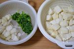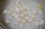 里芋を洗って皮をむき、小さめの一口サイズに切って塩でもんで水で洗い、水気を切っておく。七草は、白い実の部分は火が通りやすいように薄く輪切り(大きいものはいちょう切りでも)にする。緑の部分はさっと塩ゆでして水にとって冷まし、水気を絞って粗く刻む。 | |