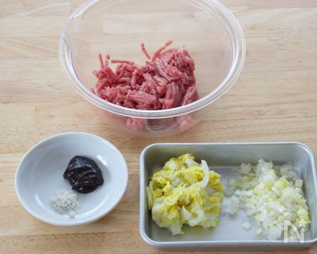 ①長ネギと白菜を細く刻みます。白菜は電子レンジ600Wで3分加熱して水気を絞ります。