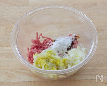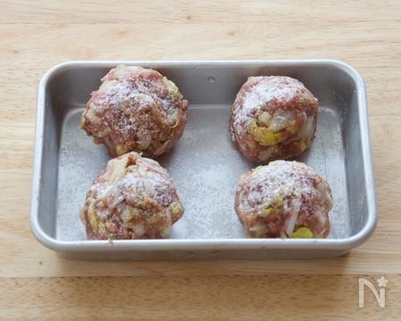 ③全ての材料がなじんだら、4等分にして丸めておきましょう。片栗粉をまぶしておくと生地にのせやすいですよ。