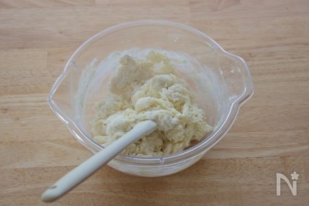 ①材料をボウルに入れて、粉気が無くなるまでゴムベラなどで混ぜます。生地がひとまとまりになったら、ボウルから出してパン生地の要領で捏ねると捏ねやすいです。