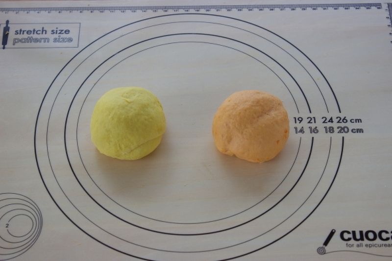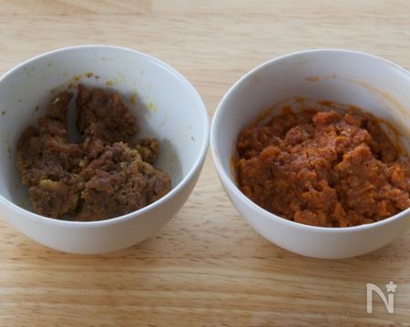 ①まずは生地を作ります。Aにピザまんはパプリカパウダーを、カレーまんはカレー粉をくわえます。このとき、数滴水を加えてペーストにしてから生地にまぜると馴染みやすいですよ。