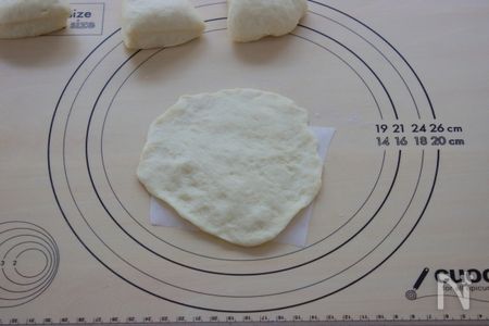②生地を2~3㎝の丸型に伸ばしたら淵を1㎝ぐらいに薄くします。周りを薄くする事で包んだ時、トップの生地がふくらみ過ぎてしまうのを防いでくれます。