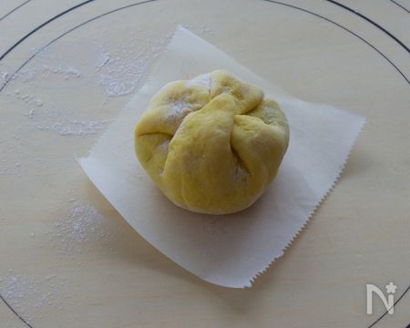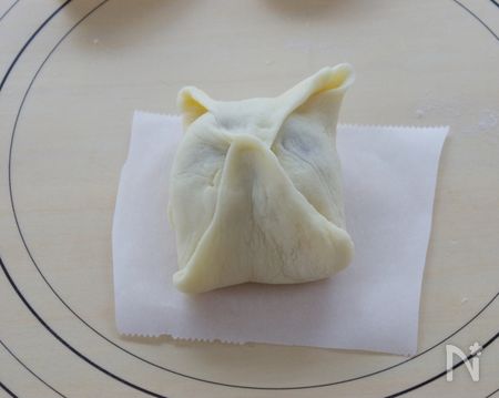 ④さらに斜めに生地を引っ張り、中央に寄せます。生地が剥がれない様に生地の中央部分を餡にくっつけるようにして接着します。
