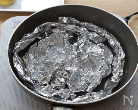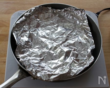 最後に蒸していきましょう。自宅に蒸し器がない・・という方も大丈夫! フライパンとアルミホイルさえあれば簡単に蒸すことができます。