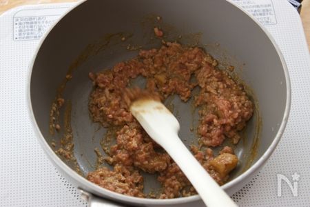 ②次にタネを作っていきます。タネは水分を飛ばしながら炒めましょう! 別の容器に入れてしっかり冷ましておきます。