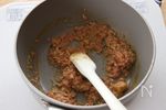 小鍋にA ひき肉 50g、レトルトカレー 50g、カレー粉 小さじ1/2、塩 少々 を入れて水分が飛ぶまで炒める同様にB ひき肉 100g、ミートソース 50g、ケチャップ 小さじ1、塩 少々 も炒める冷ましておく |