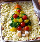 ③ブロッコリーをツリー型に並べる。 ブロッコリーの房の間にプチトマトを彩りよく並べる。 ツリーの一番上に星型パプリカを置いてチーズを周りに散らす。 ツリーの下にパン耳で白(表)・茶(裏)交互に並べ鉢(かご?)を作る |