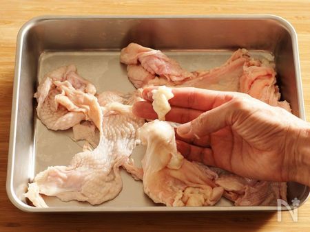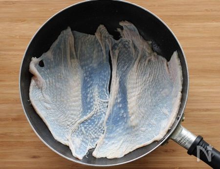 やわらかな鶏皮独特の食感とうまみを味わう、ふにゃふにゃバージョン。こちらの下ごしらえも、まずは、余計な脂をとって塩を揉み込みます。