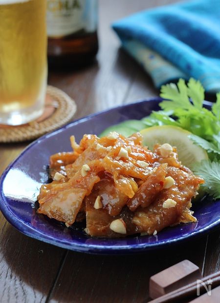 そして、パリパリおつまみラストは、焼いた鶏皮をスイートチリソースを和えたエスニック風。ビールが進むこと間違いなしですよ!