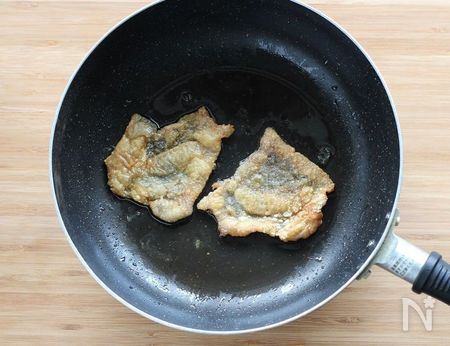 途中で丸まってきたら、フライ返しで押さえたり、裏返したりしながら、じっくり焼きます。焼いているとたくさんの油が出てきますが、この油で揚げるように焼くと、風味もよく全体にきれいな焼き色がつきます。油がはねたりしますので、注意して焼いて下さいね。