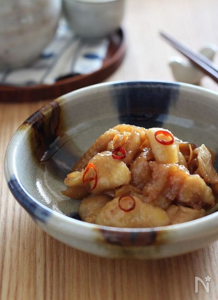 生姜をたっぷり入れて鶏皮の佃煮茹でた鶏皮を甘辛く煮ると、お酒のおつまみだけでなく、ご飯のおかずにもぴったりです。隠し味のお酢がおいしさのポイントです。
