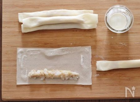 2.春巻きの皮にスライスチーズとつぶした里芋を細長くのせて巻き、巻き終わりは水で溶いた小麦粉でとめる。皮の左右は中に折り込まず、ぎゅっとつぶすようにしてつける。