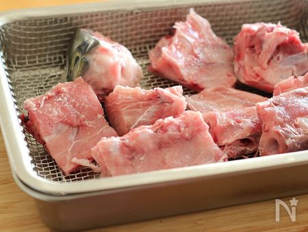 鍋にお湯を沸かしたら、ぶりを入れ、全体が白くなったらざるにあけ、冷水にとります。