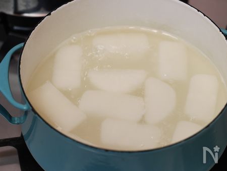 米のとぎ汁に大根を入れて火にかけ、下茹でをします。楊枝が刺さるくらいのやわらかさになったら、ざるにあけて洗っておきます。