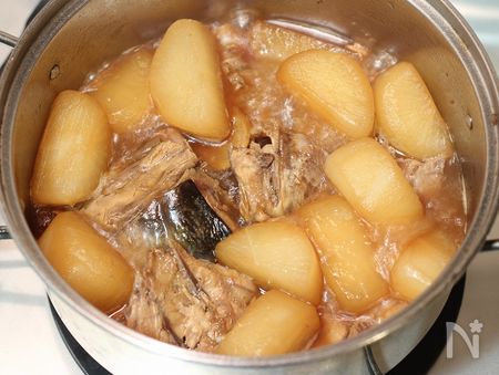 3.20分ほど煮込みます。煮汁が少なくなって大根に照りが出たらできあがりです。
