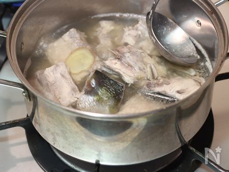 1.鍋に水と日本酒と昆布を入れて火にかけ、沸騰したら、下ごしらえしたぶりのアラと、皮つきのまま薄切りにしたしょうがを入れて数分煮ます。このとき、アクがでてきたら取り除いてください。
