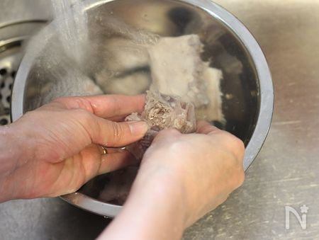 流水で、血の塊やうろこ、ぬめりなどをしっかり取ります。骨の間の血などもしっかり洗い、キッチンペーパーなどで水けを取ります。