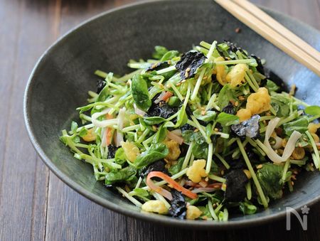 シャキシャキ食感のサラダは、ポン酢でさっぱり。焼き海苔の香りと天かすのコクと食感も楽しいサラダです。