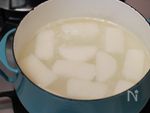 米のとぎ汁に大根を入れて火にかける。 楊枝がささるくらいの柔らかさになったら、ざるにあけて洗う。 |