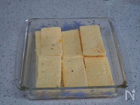 3、2に食パンを浸します。汁気がなくなるまで染み込みましょう。