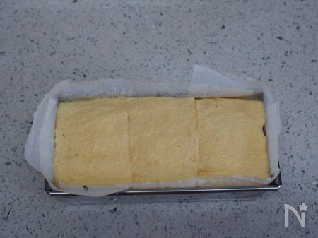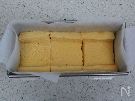 4、パウンド型に、3を3枚写真のように横に並べて敷き詰めます。