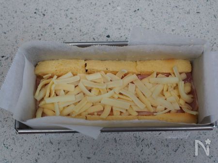9、1番上に食パンを3枚スキマができないように敷き詰めます。大きければ、端を少しカットして下さい。