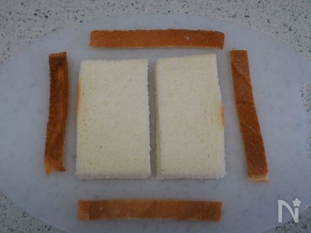1、食パン(8枚切り)は、耳を落とし半分に切っておきます。