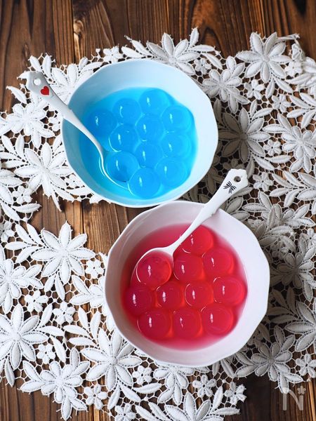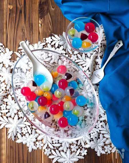 まるで、ビー玉のようにカラフルで見た目にも楽しい九龍球。今回ご紹介した2種類の九龍球を組み合わせて盛り付けてもかわいいですよ♪ 中のフルーツを変えたり、かき氷シロップの味を変えたりなどアレンジは無限大! 休日のおやつや、お客さんが来た時のおもてなしにいかがでしょうか?