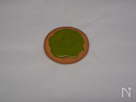 5.ビスケットを平らなお皿の上において、溶かした抹茶チョコをぬり、2を逆さまにしてくっつけます。冷蔵庫に入れて固まるまで待ちます。