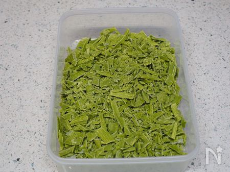 4.フライパンなどに水を入れて、50度まで温めます。そこに3をタッパーごとつけて抹茶チョコを溶かします。この時、チョコに水が入らないように気をつけてください。