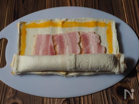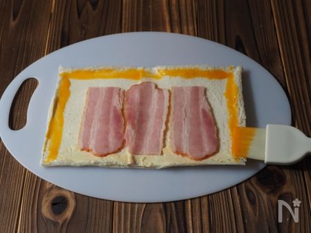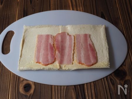 5. 1枚を3等分したベーコンを、両端を空けて手前に、3枚並べます。(お好みで、黒胡椒を振っても良い)