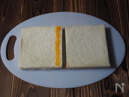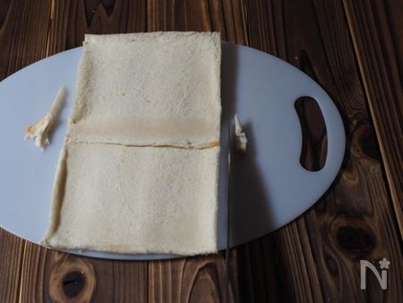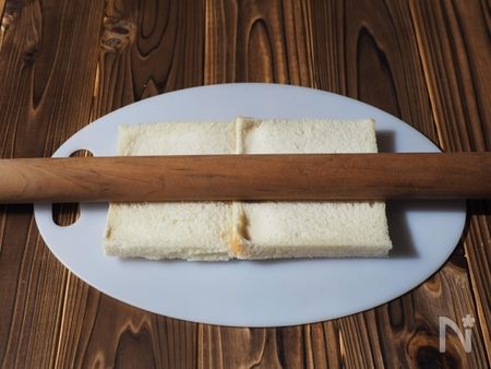 1.耳を切り取った食パンを2枚横に並べます。中央を1cm位重ね、重なる所の片側に卵黄を塗っておきます。