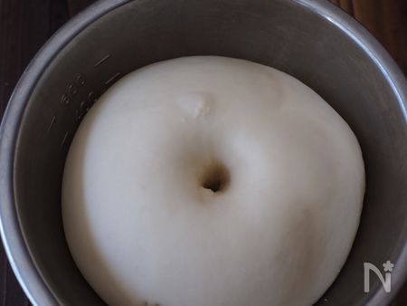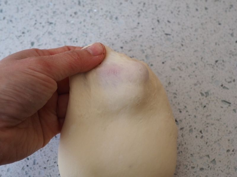 8、2倍くらいに膨らんだら取り出し、フィンガーテストをします。人差し指に粉を付けて差し込みます。指の跡がそのまま残っていれば合格! 指のあとがすぐに消えて戻ってしまうのは発酵不足、全体が沈んでしまったら発酵しすぎの証拠です。