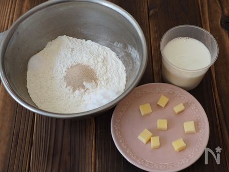 1、ボウルに、強力粉、ドライイースト、砂糖、塩を入れます。