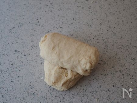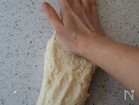 4、生地を手前に折り戻します。3~4を繰り返します。15分~20分ほどこね続けると生地がまとまってきます。